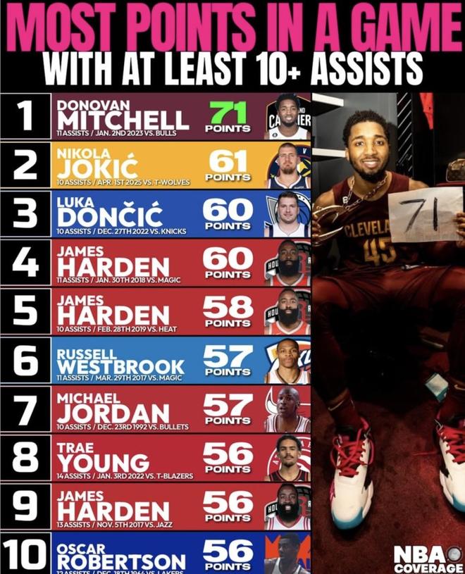 NBA单场爆砍高分+10次以上助攻排名!哈登60分+10助攻只排第四